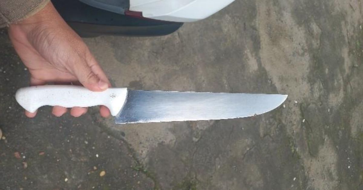 Durante as buscas, os policiais localizaram o suspeito, que tentou fugir, mas foi alcançado e abordado. Com o adolescente, os policiais encontraram uma faca do tipo açougueiro escondida em suas vestes. Questionado sobre o motivo de estar com a arma, o jovem afirmou que “estava caçando passarinhos”.