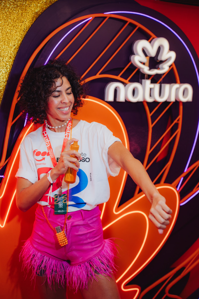 Na estação de beleza e autocuidado da Natura, dentro do Camarote Expresso 2222, Bela Gil falou sobre os rituais que a acompanham no Carnaval de Salvador. Para ela, a preparação começa pelo básico: “Primeiro, antes de tudo, me tratar. Eu acho que é muito importante usar filtro solar”.