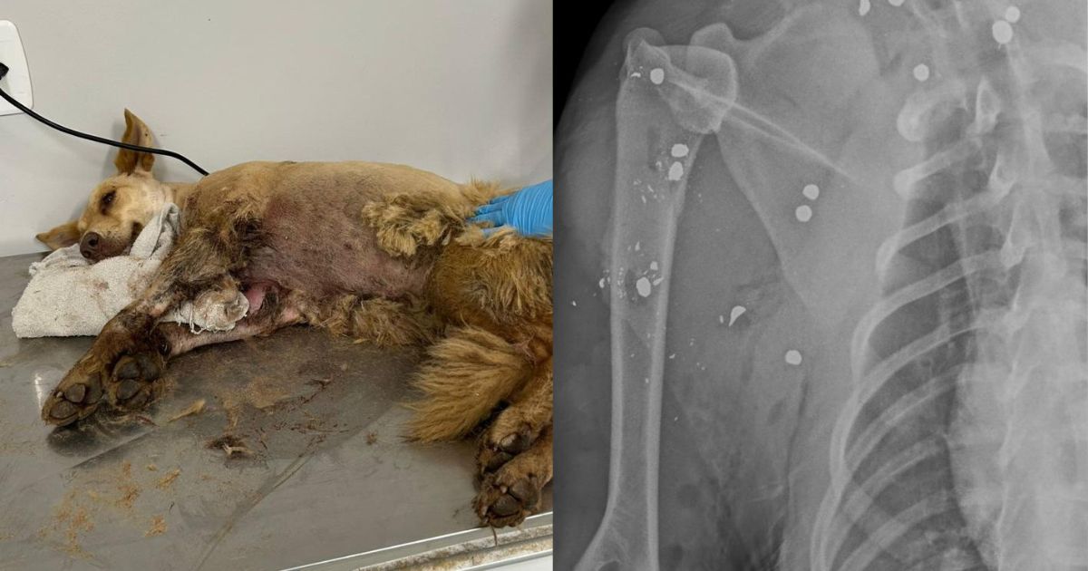 O animal foi levado a uma clínica veterinária, onde exames de imagem revelaram mais de 20 projéteis de chumbinho espalhados pelo corpo. A cadela passou por cirurgia de emergência e permanece internada, recebendo os cuidados necessários da equipe médica.