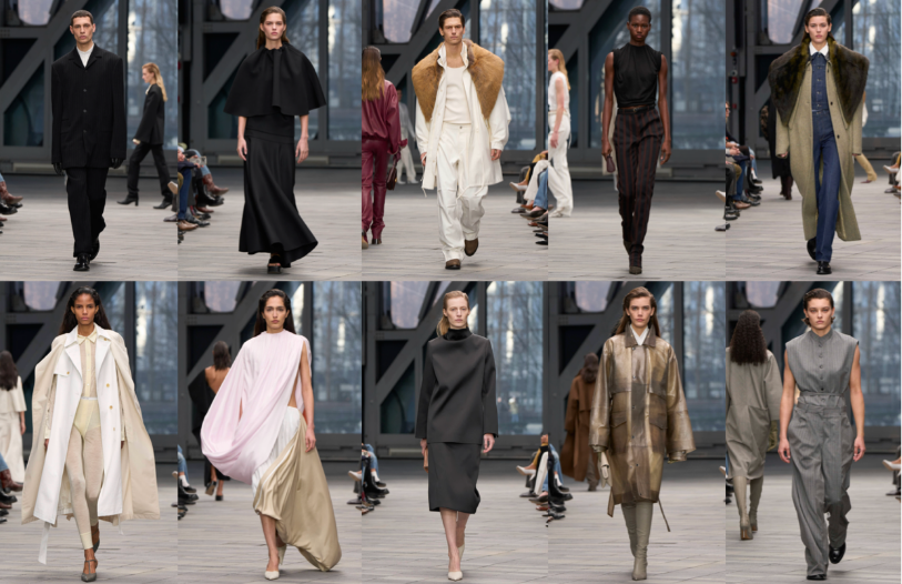 A coleção apresentou peças essenciais como trench coats, alfaiataria precisa, vestidos estruturados e casacos longos. O denim teve destaque em referências ao arquivo de 1976, incluindo um terno completo e o logotipo original bordado à mão em jaquetas e casacos.