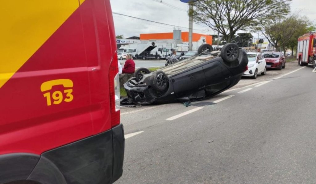 Um carro capotou na Linha Verde, no bairro Pinheirinho, em Curitiba, após um acidente entre dois carros. A batida aconteceu na tarde deste sábado (11) e deixou duas pessoas feridas.
