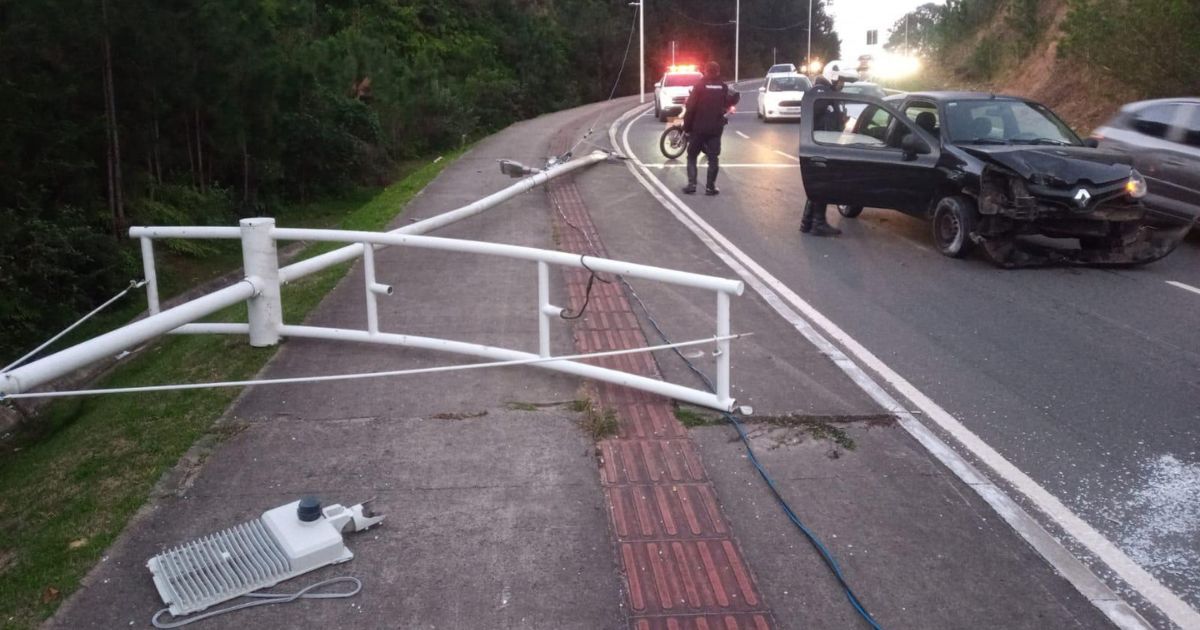 Um carro colidiu contra um poste na Avenida Panorâmica e, com a força do impacto, a estrutura foi derrubada. A colisão foi registrada por volta das 17h30 de sábado, 19. Segundo informações dos agentes da BC Trânsito que atenderam a ocorrência, o condutor abandonou o veículo e fugiu do local.