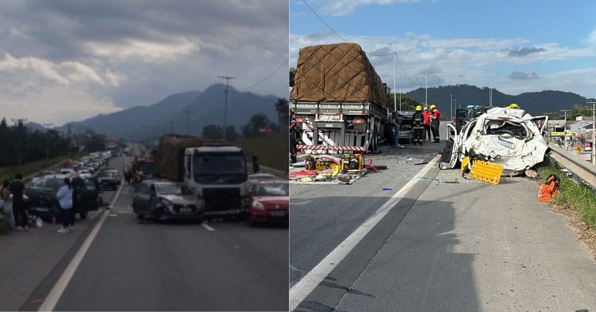 Um engavetamento envolvendo sete carros e um caminhão carregado com frutas foi registrado na tarde deste domingo (16) na BR-470, nas proximidades do viaduto de acesso ao Bairro Carijós, em Indaial. O acidente mobilizou equipes de socorro e deixou o trânsito completamente bloqueado na via principal.