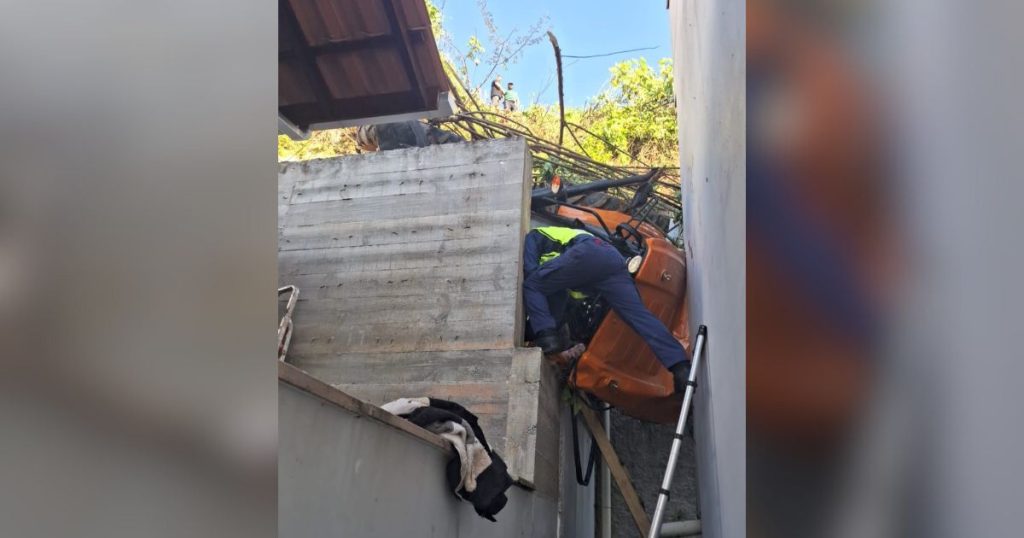 A condutora manobrava o veículo, quando caiu de uma altura de aproximadamente cinco metros. O trator ficou preso entre um muro de contenção de concreto e uma casa. O Corpo de Bombeiros foi acionado e encontrou a mulher ainda dentro do veículo.