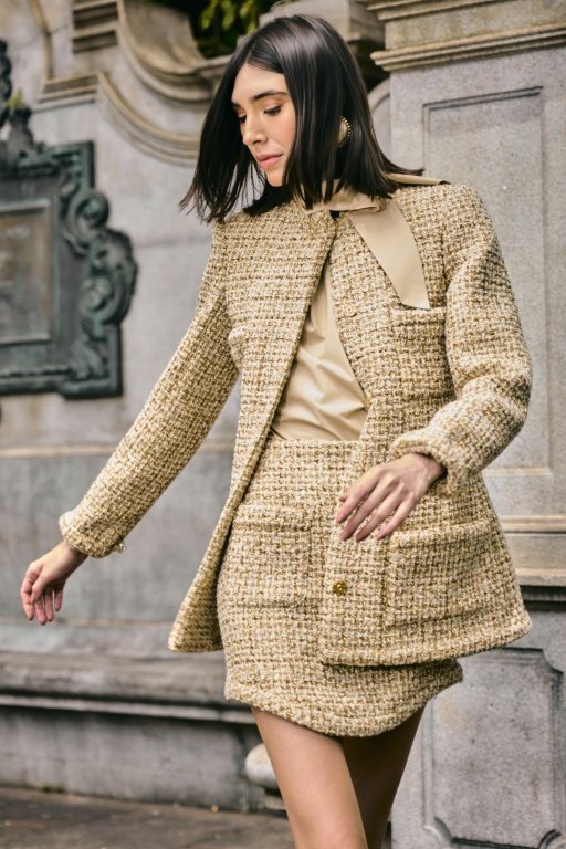 No preview, a marca apresenta camisarias estruturadas em off-white e bege e peças exclusivas em tweed, que unem lã, algodão e fios metálicos. O resultado traduz a essência artesanal e o olhar apurado para texturas e acabamento, pilares da Herança Boêmia.