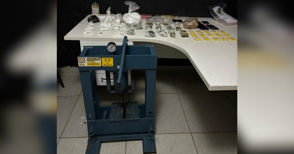 Os policiais foram acionados por volta das 19h30 para atender uma ocorrência de lesão corporal relacionada à Lei Maria da Penha. Ao chegarem ao local, perceberam um forte odor de maconha vindo de uma das residências. Com autorização do proprietário, a guarnição entrou no imóvel e encontrou uma prensa metálica e materiais usados para preparo e embalo de drogas.