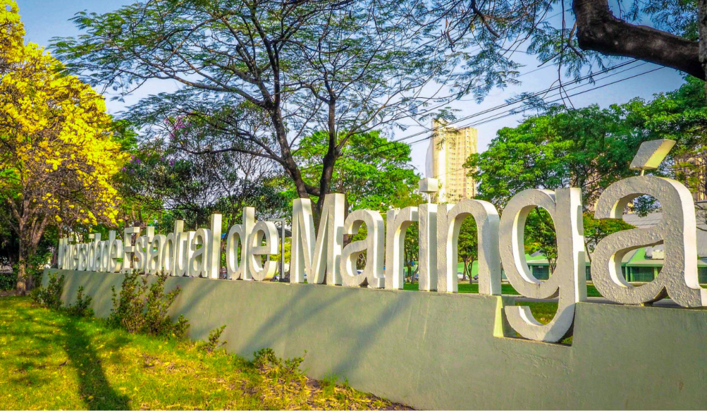 Área externa da Universidade Estadual de Maringá. Em primeiro plano, um letreiro com o nome da Universidade. Ao fundo, vemos a fachada do prédio.