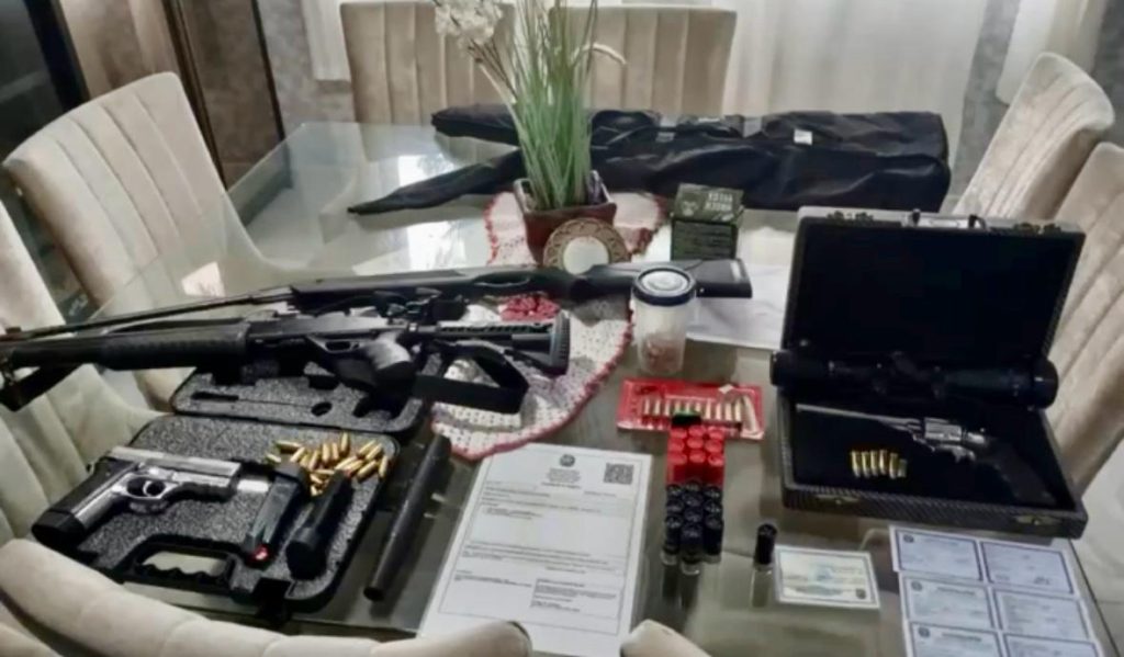 Uma ação da Polícia Civil de Navegantes resultou na apreensão de quatro armas de fogo, 125 munições e um silenciador. O material foi encontrado durante o cumprimento de um mandado de busca e apreensão expedido pela Justiça, após o avanço de uma investigação iniciada por conta de disparos de arma que feriram um cachorro.