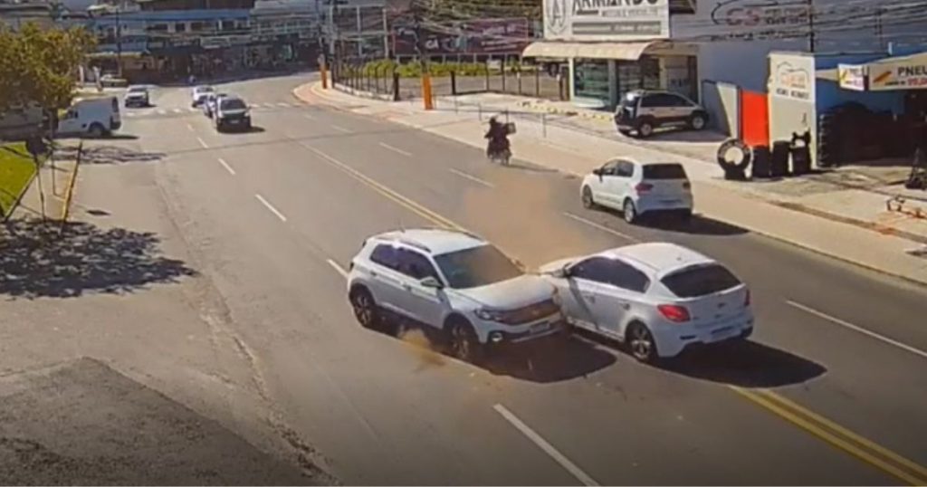 Imagens de uma colisão entre dois veículos na Avenida Santa Catarina, em Camboriú, circularam na internet. A batida foi nas proximidades da Central de Luto, por volta das 13h56 deste sábado, 31.